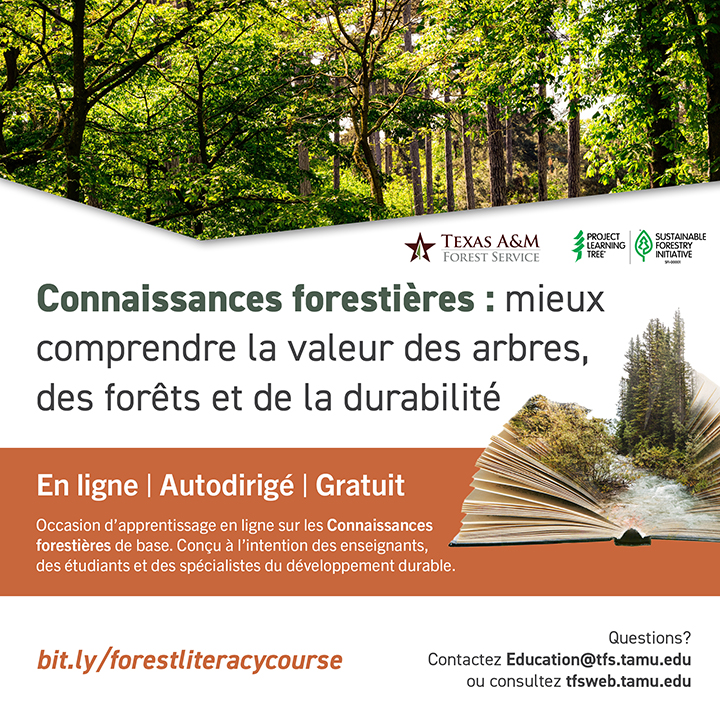 Développé par le Texas A&M Forest Service (Service forestier Texas A&M) en collaboration avec Project Learning Tree (PLT), une entité éducative primée mise sur pied par la SFI, et avec le soutien du Service forestier américain (USDA Forest Service), ce cours offre des connaissances pratiques pour approfondir la compréhension et l’engagement autour de la valeur et des nombreux avantages des forêts. Le cours a été élaboré à partir du Forest Literacy Framework (Cadre d’enseignement forestier) de PLT et du Forest Literacy Plan (plan d’enseignement forestier) du Texas.
