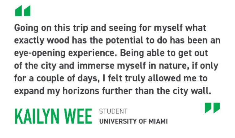 “Into The Woods: A Carbon Story,” in partnership with FAMU and the University of Miami School of Architecture’s LU Lab, addresses this gap by providing students with hands-on experiential learning opportunities in resource management and sustainable forestry. Through this partnership, students expanded their learning beyond a traditional classroom setting to see various parts of the forest product journey. From where it all starts in the forest, to timber harvesting and wood products manufacturing, students had the opportunity to witness firsthand how SFI-certified building products are produced and explore the origin of forest-based construction materials. Bridging the gap between theory and practice, the project allowed students to better understand the deep connection between forests and buildings, as well as make better-informed decisions as future architects.